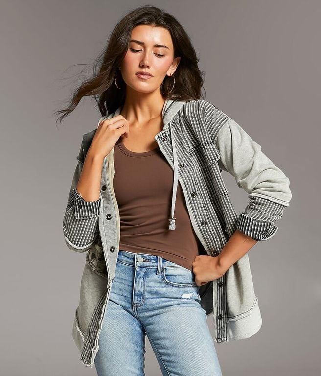 Pieced Camo Stripe Hooded Shacket - Gray - BKE Jackets