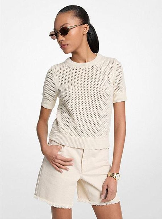 Cotton And Cashmere Mesh Short-Sleeve Sweater - White - Michael Kors Tops