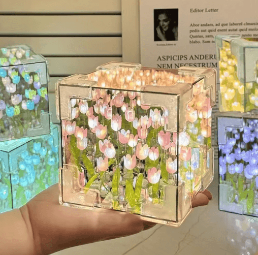 DIY Tulip Mirror Cube Night Lamp 3D Flower Bedside Light pink 20 Tulips 8cmx8cm