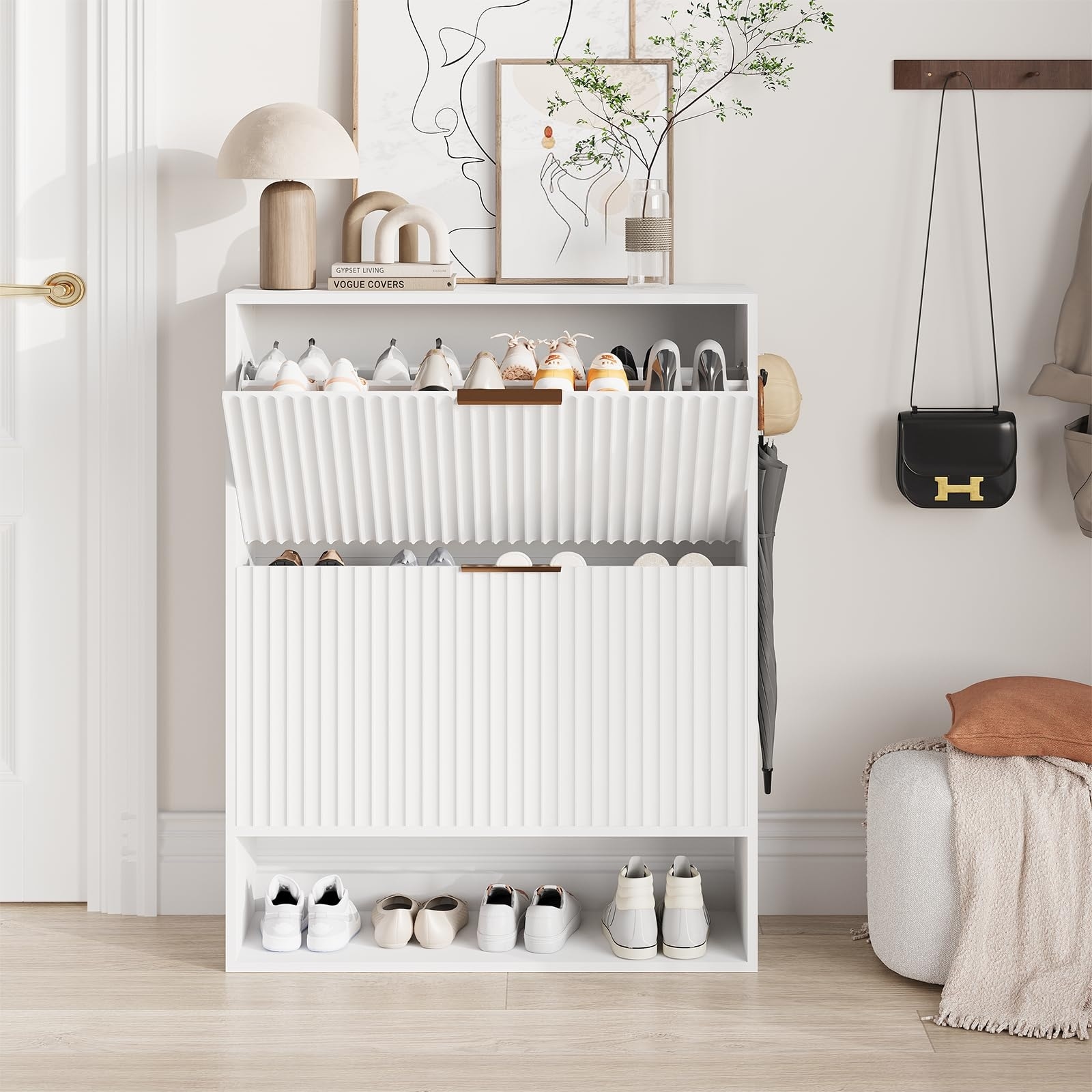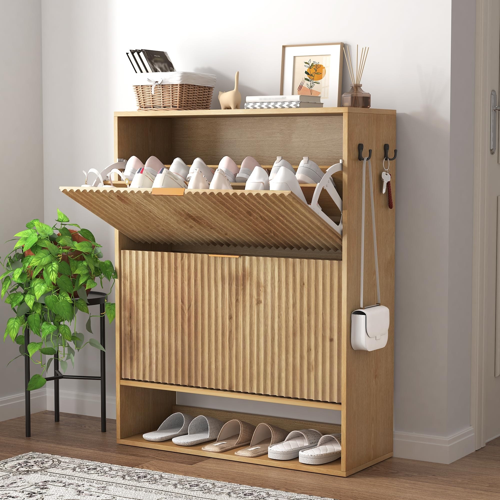 Fluted Shoe Storage Cabinet, Slim Hidden Shoe Rack Cabinet with 2 Flip Drawers & Bottom Open Shelf