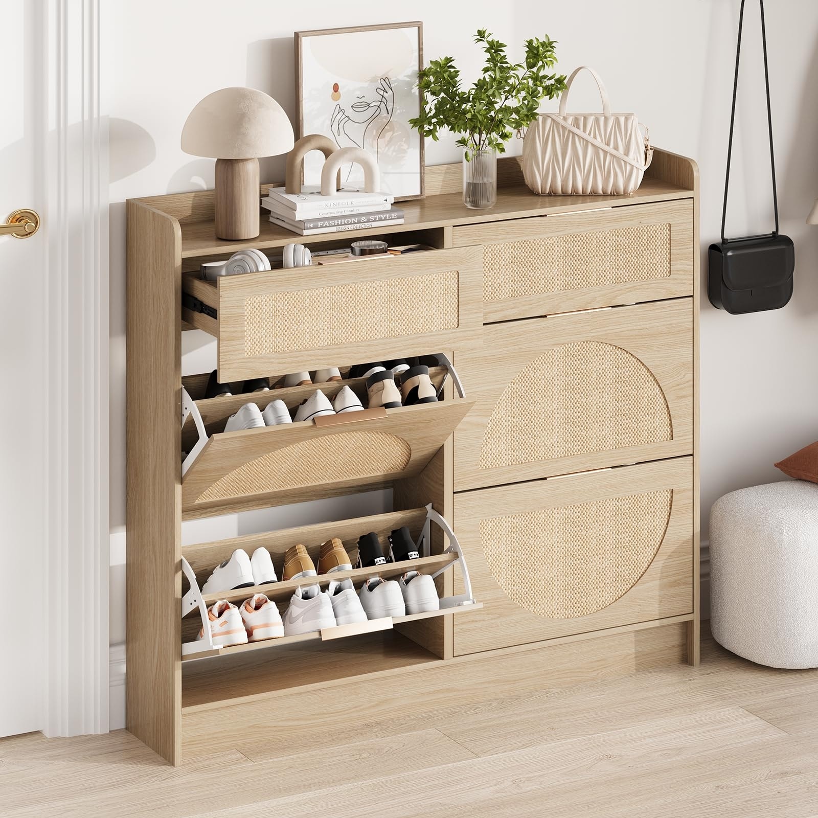 Rattan Shoe Storage Cabinet, Narrow Flip Drawer Shoe Organizer with Adjustable Shelves for Entryway