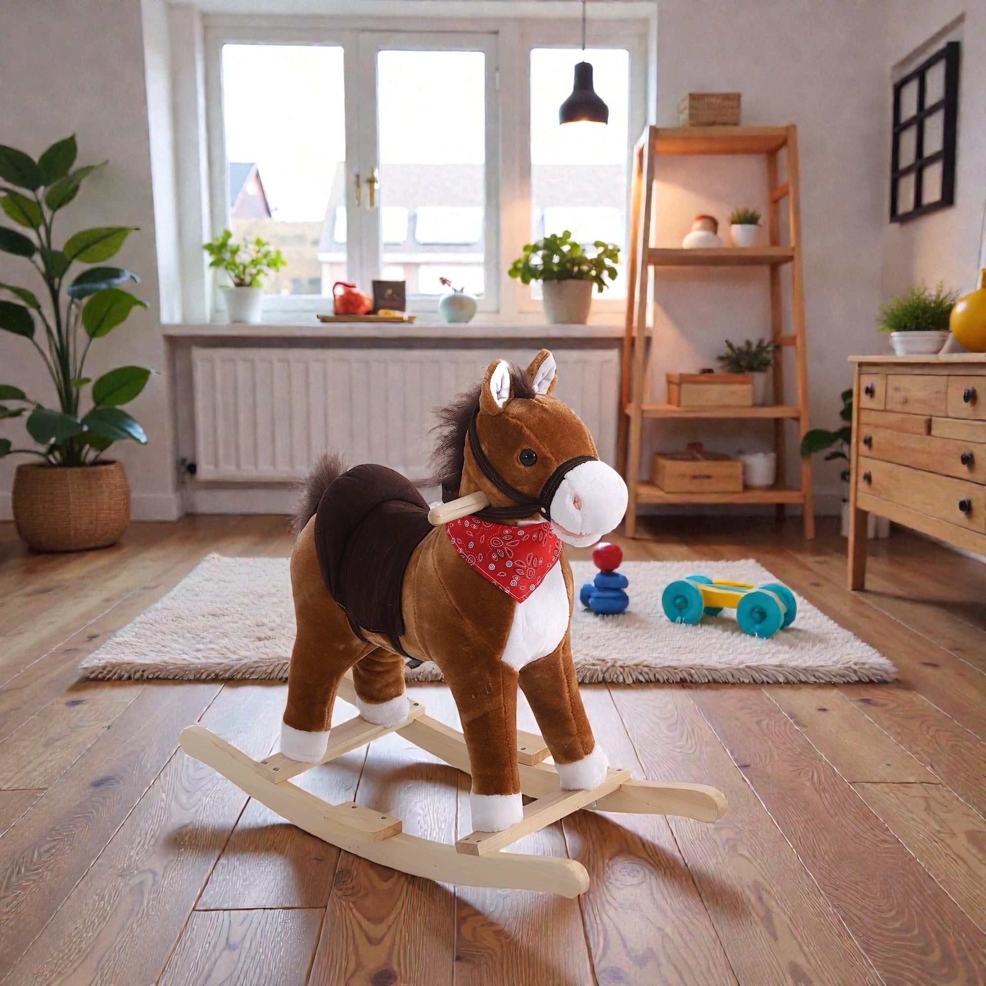 Kids Plush Rocking Horse Ride On Toy with Realistic Galloping Sounds Red Scarf Saddle for Ages 3 Years Up