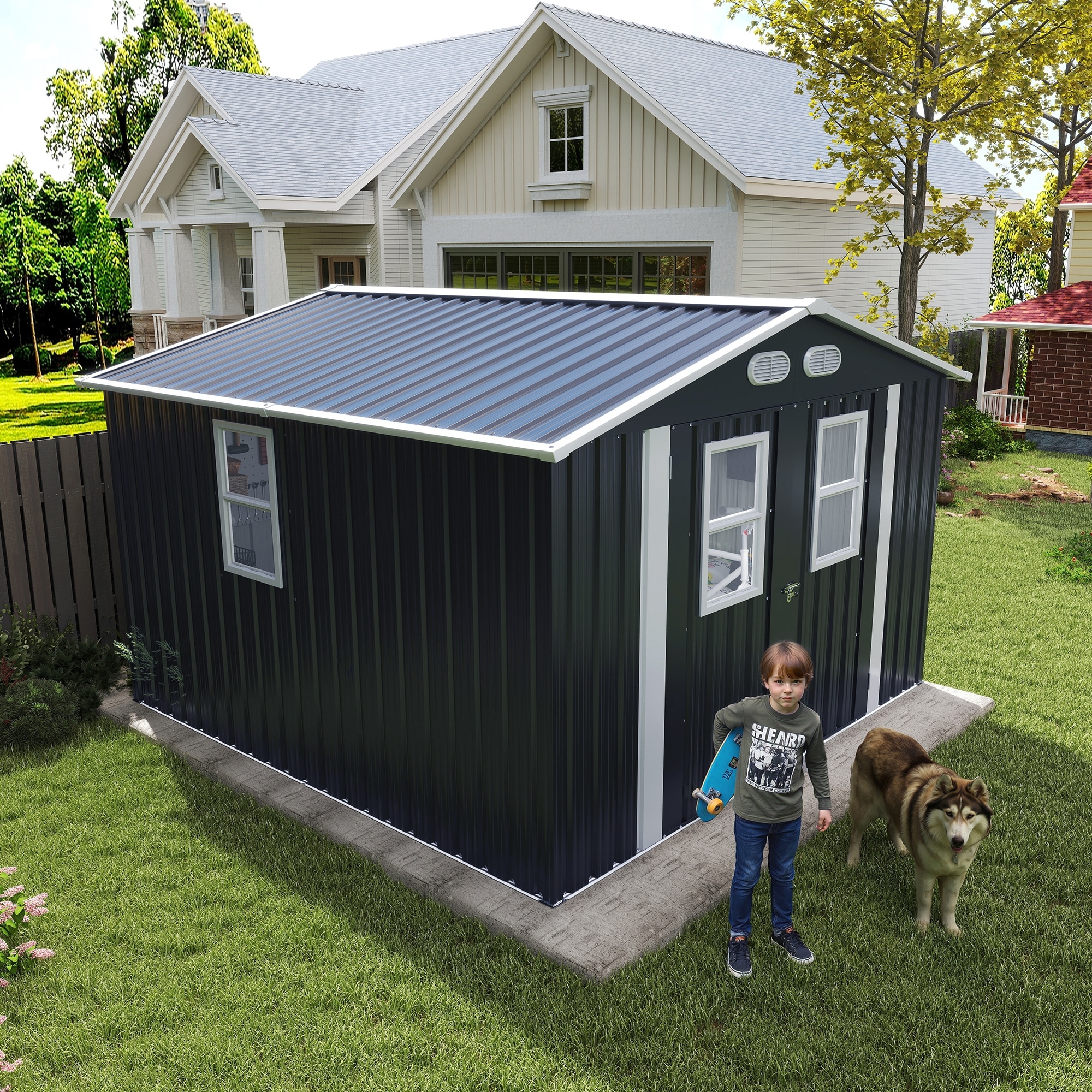 12x10 FT Galvanized Steel Storage Shed with Lockable Door and Windows