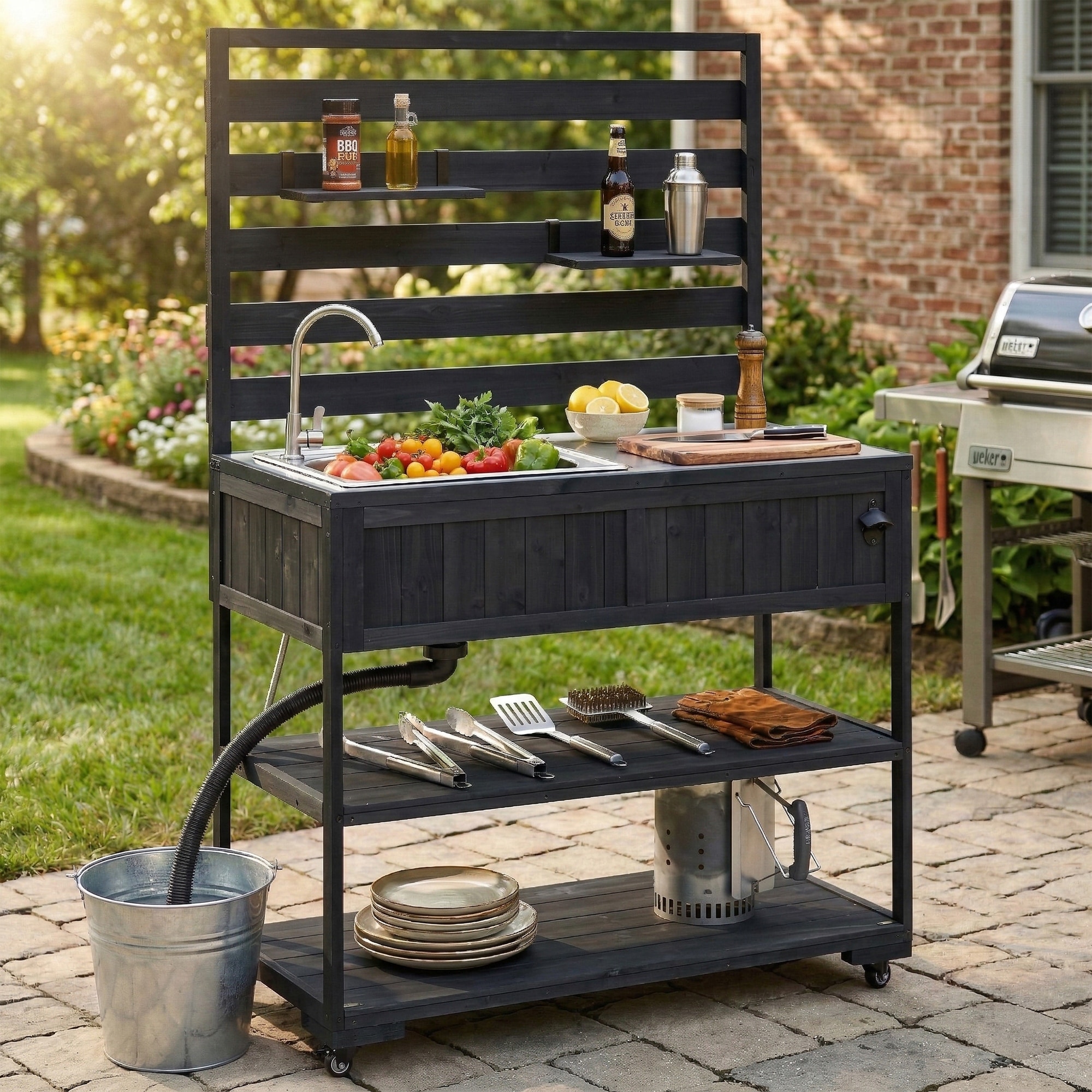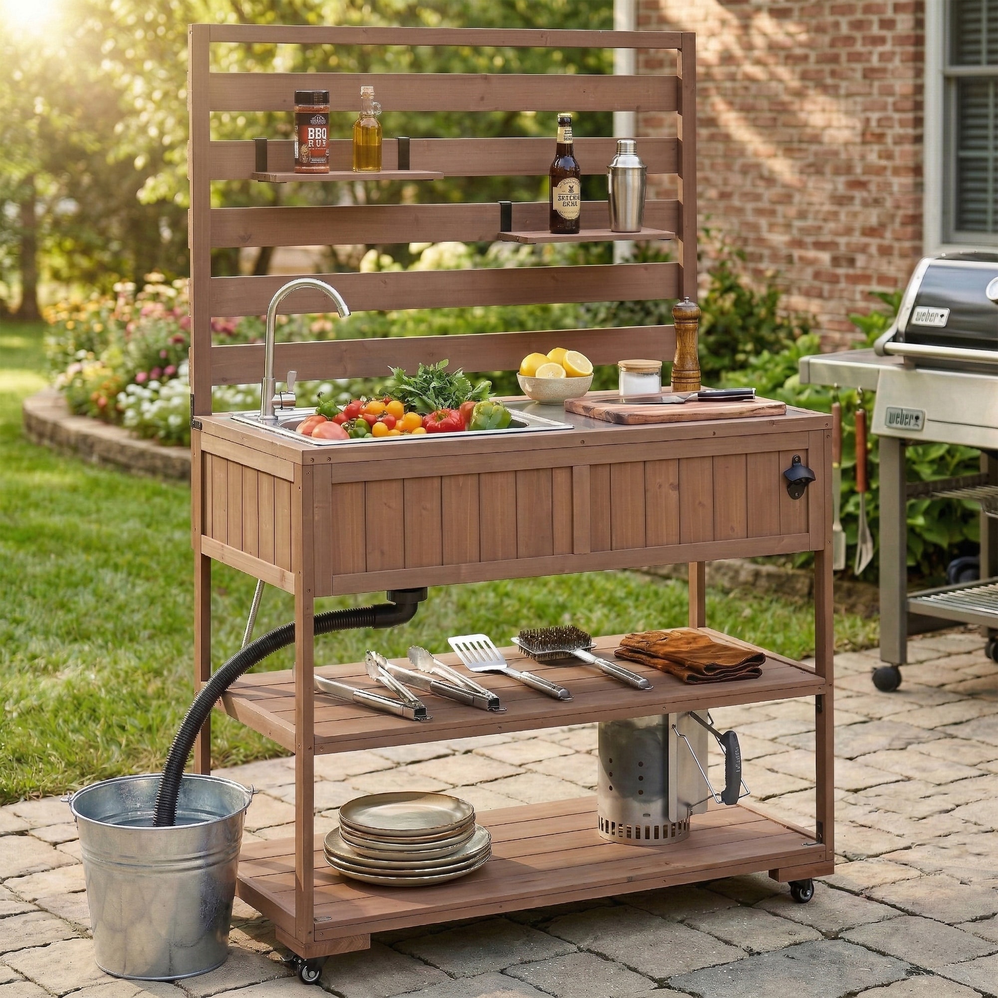 Roomfitters 41.7" Garden Potting Bench with Sink, Rolling Outdoor Potting Table, Bottle Opener, Storage Shelves, Hutch