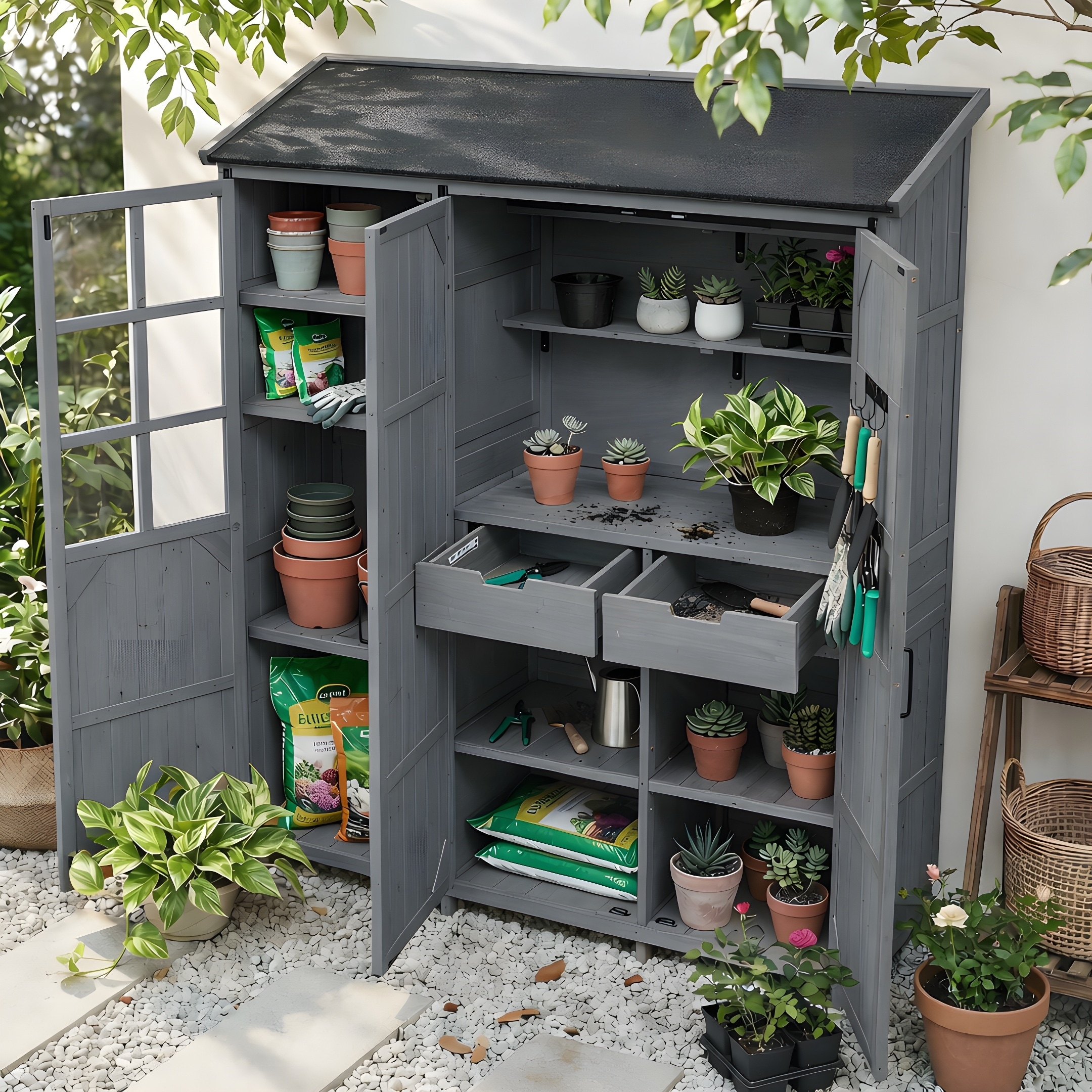 65''H Outdoor Potting Bench Garden Storage Table w/Lockable Wheels, Drawers, Cabinets & Side Hooks - N/A