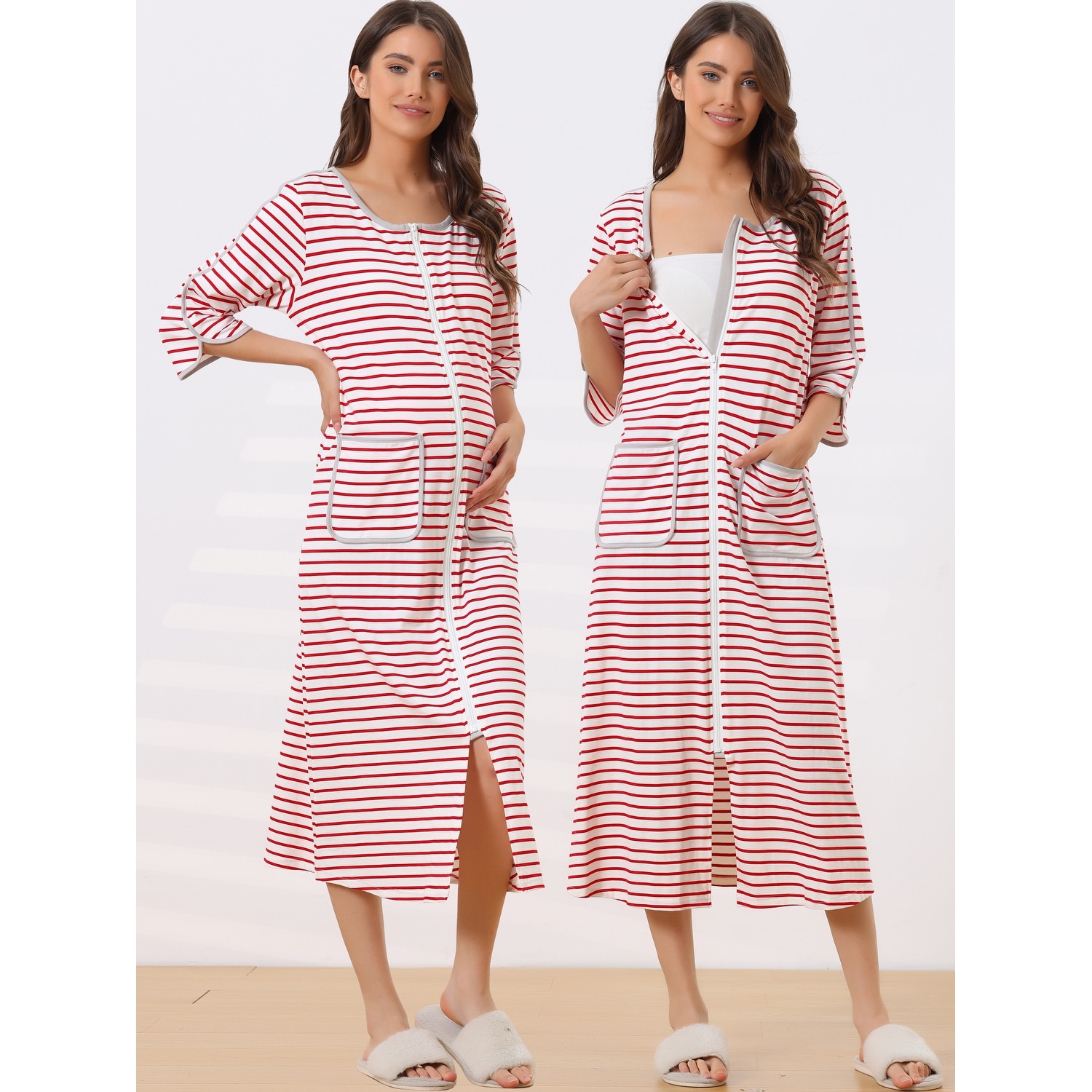 Women's Zip Front Robe 3/4 Sleeve Striped Long Bathrobe House Dress