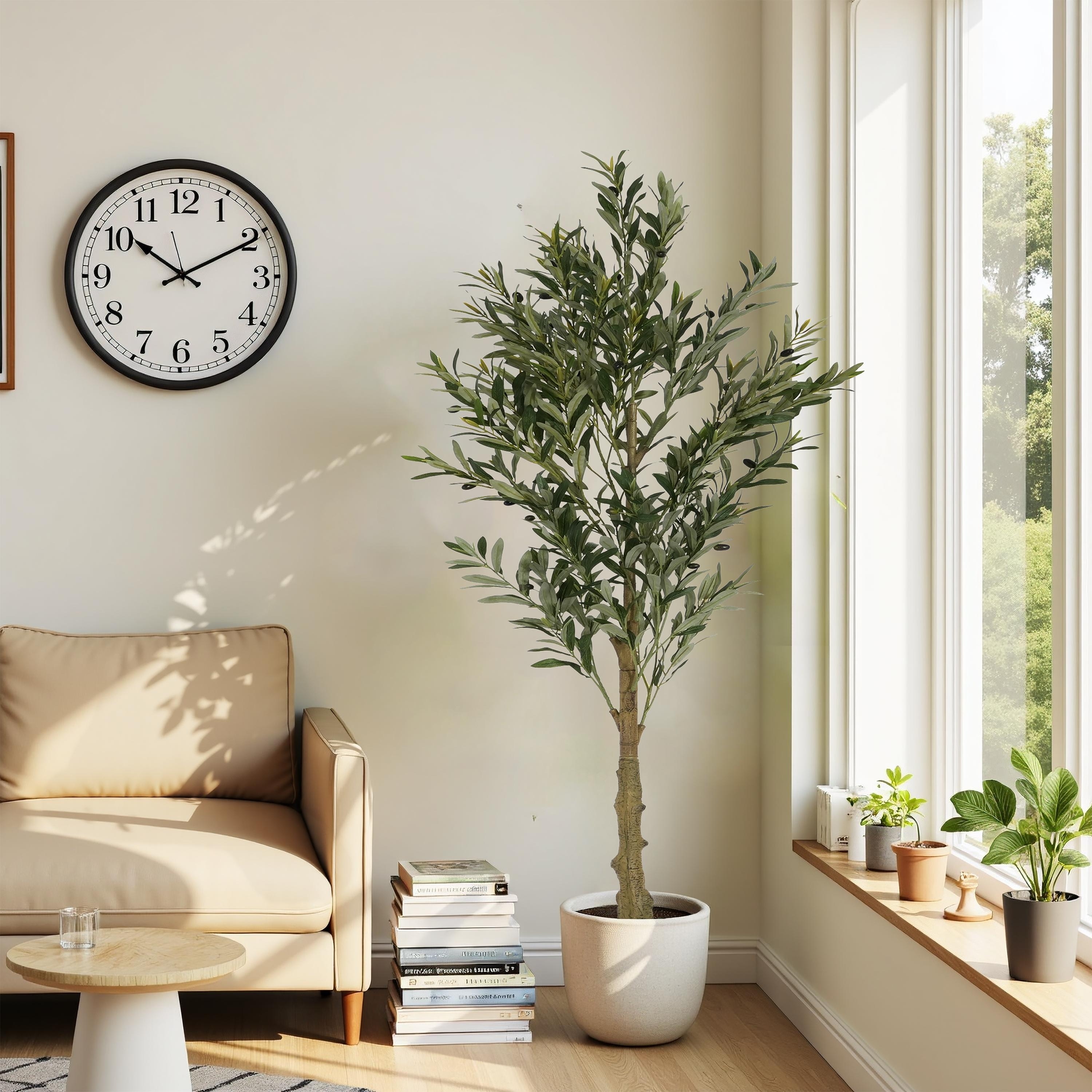 Roomfitters 6 Ft Artificial Olive Tree, Tall Faux Indoor Plant with Black Plastic Pot for Home Decor, Green