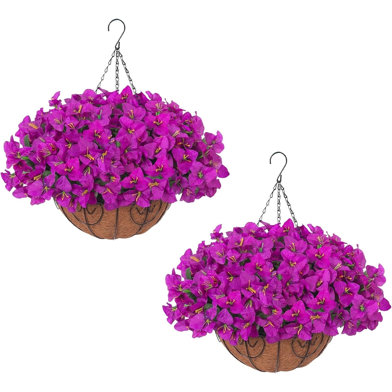2 Set Artificial Outdoor Bougainvillea Flowers with Brown Basket, Artificial Hanging Flowers Plant