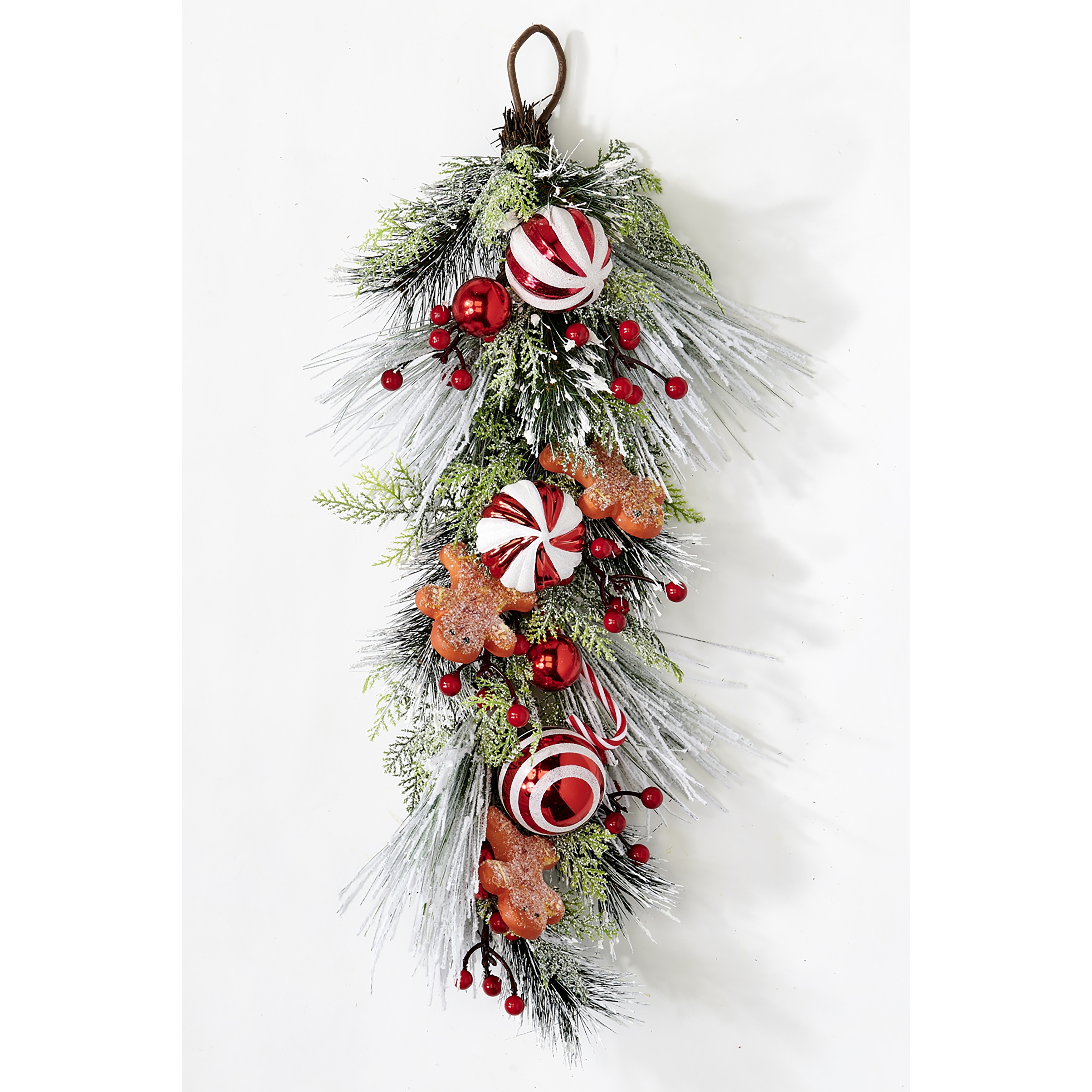 28" Snowy Christmas Artificial Pine Berry Ball Floral Teardrop With Gingerbread Men - 28