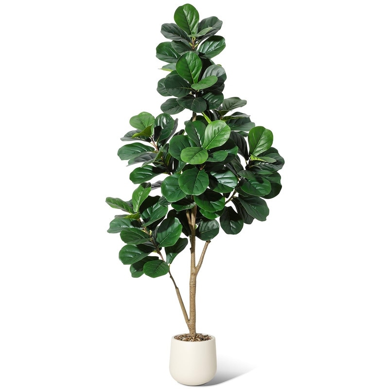 5ft Fiddle Leaf Artificial Tree in White Tower Planter with Thick Green Leaves and Decorative White Planter Accent