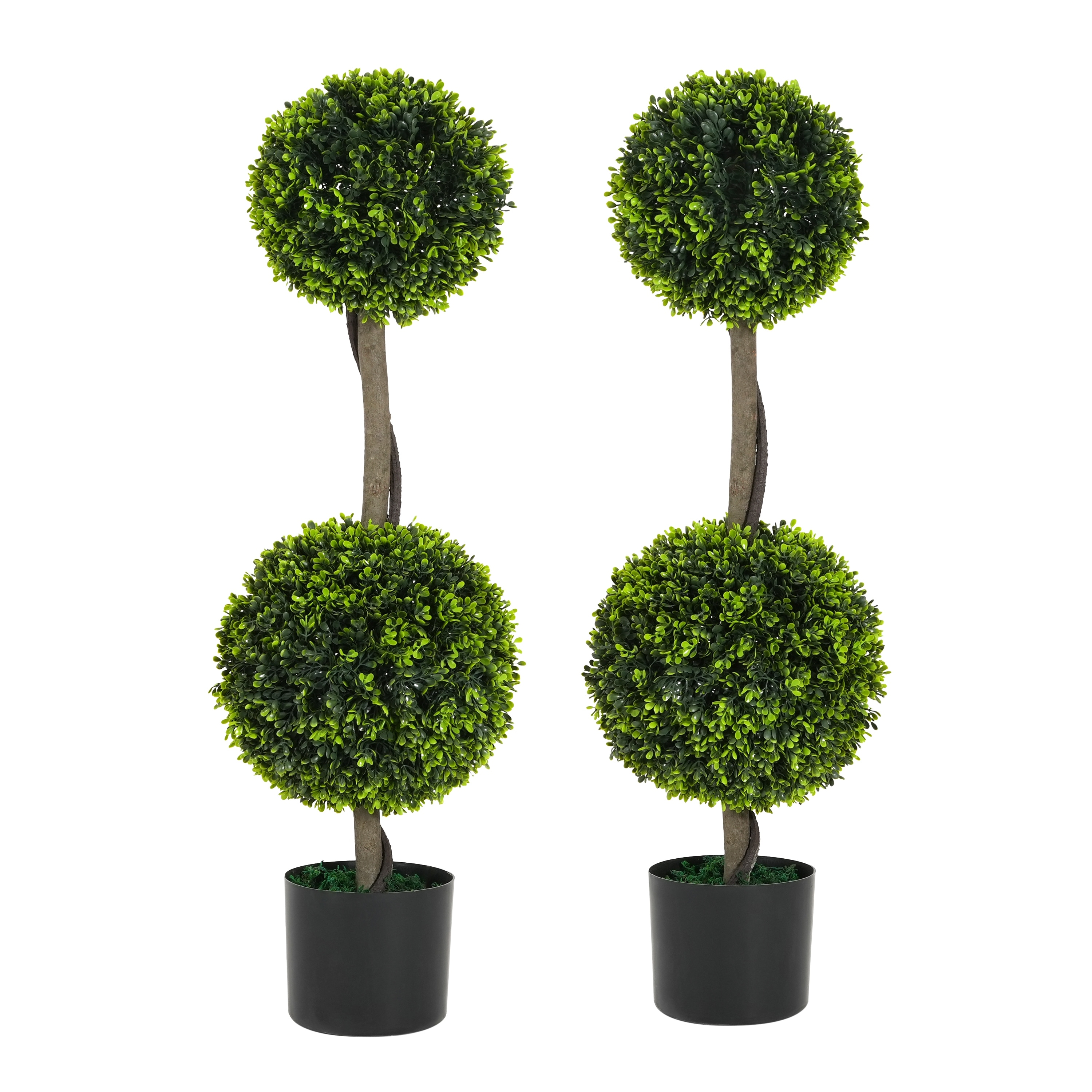 34" Artificial Topiary Boxwood Tree Double Ball with Black Plastic Pot, Set of 2