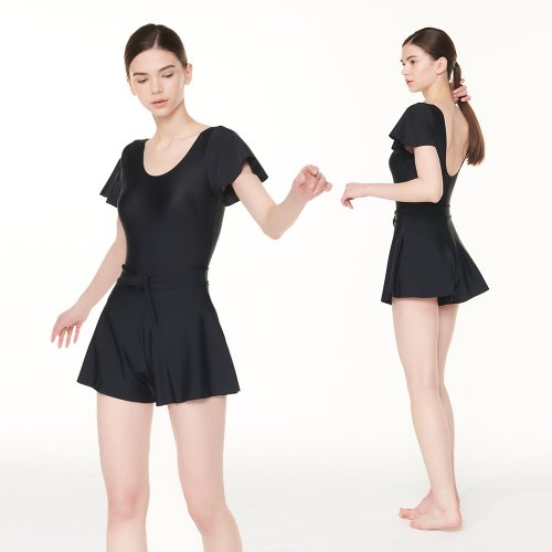 zetes Women's Frill Short Sleeve One-Piece Swimsuit + Skirt Pants Cover-up Set L_4A3270