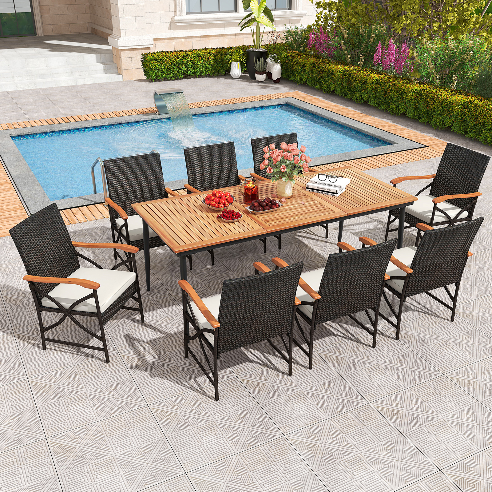 79 Inch Outdoor Dining Set With Acacia Wood Table & 8 Rattan Woven Chairs Weather Resistant Patio Furniture 79 Inch Outdoor Dining Set With Acacia Wood Table & 8 Rattan Woven Chairs Weather Resistant Patio Furniture