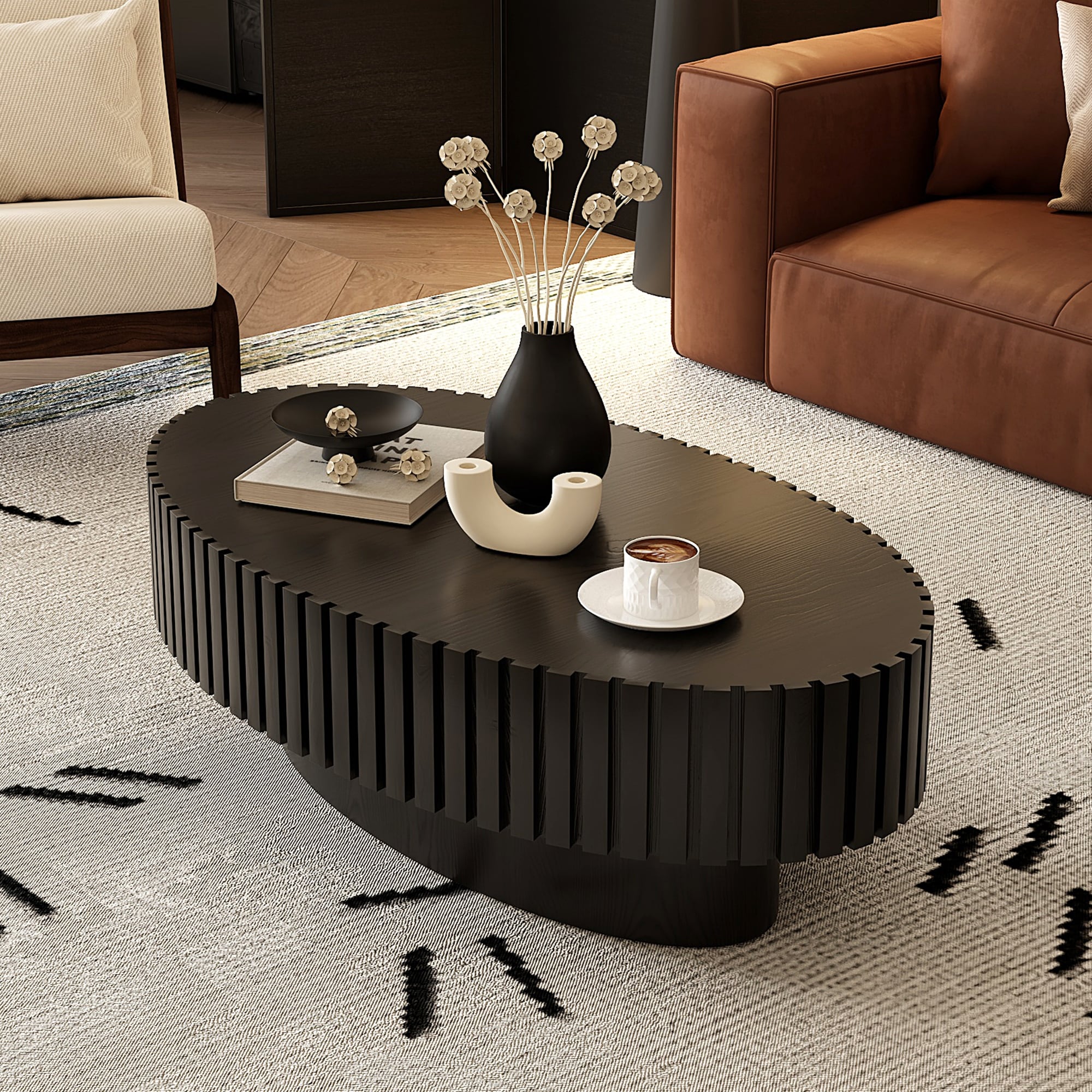 Oval Coffee Table Handcrafted Relief Sturdy Pedestal Wooden Olive-Shaped Tea Table For Living Room