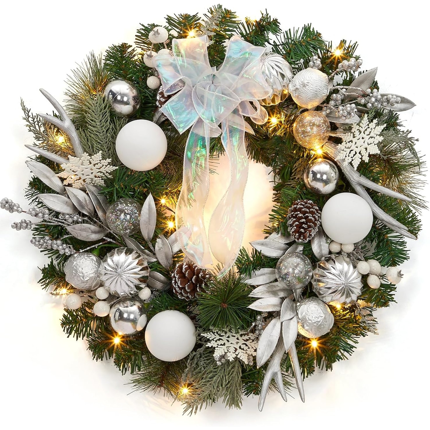 24 Inch Pre-Lit Christmas Wreath, Battery Operated Xmas Wreath