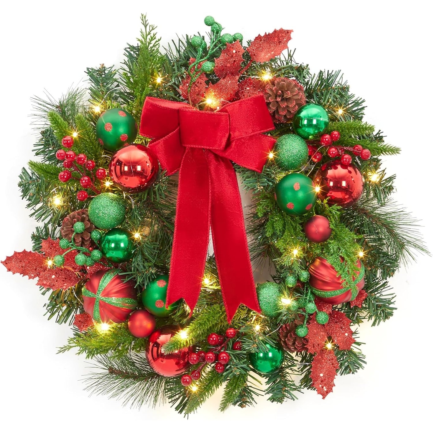 24" Large Christmas Wreath with 20 LED Lights, Pre-Lit Xmas Wreaths for Front Door