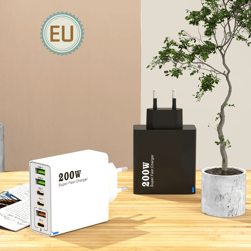 200W USB C Charger With 6 Ports For Fast Charging Multiple Devices Simultaneously eu Black